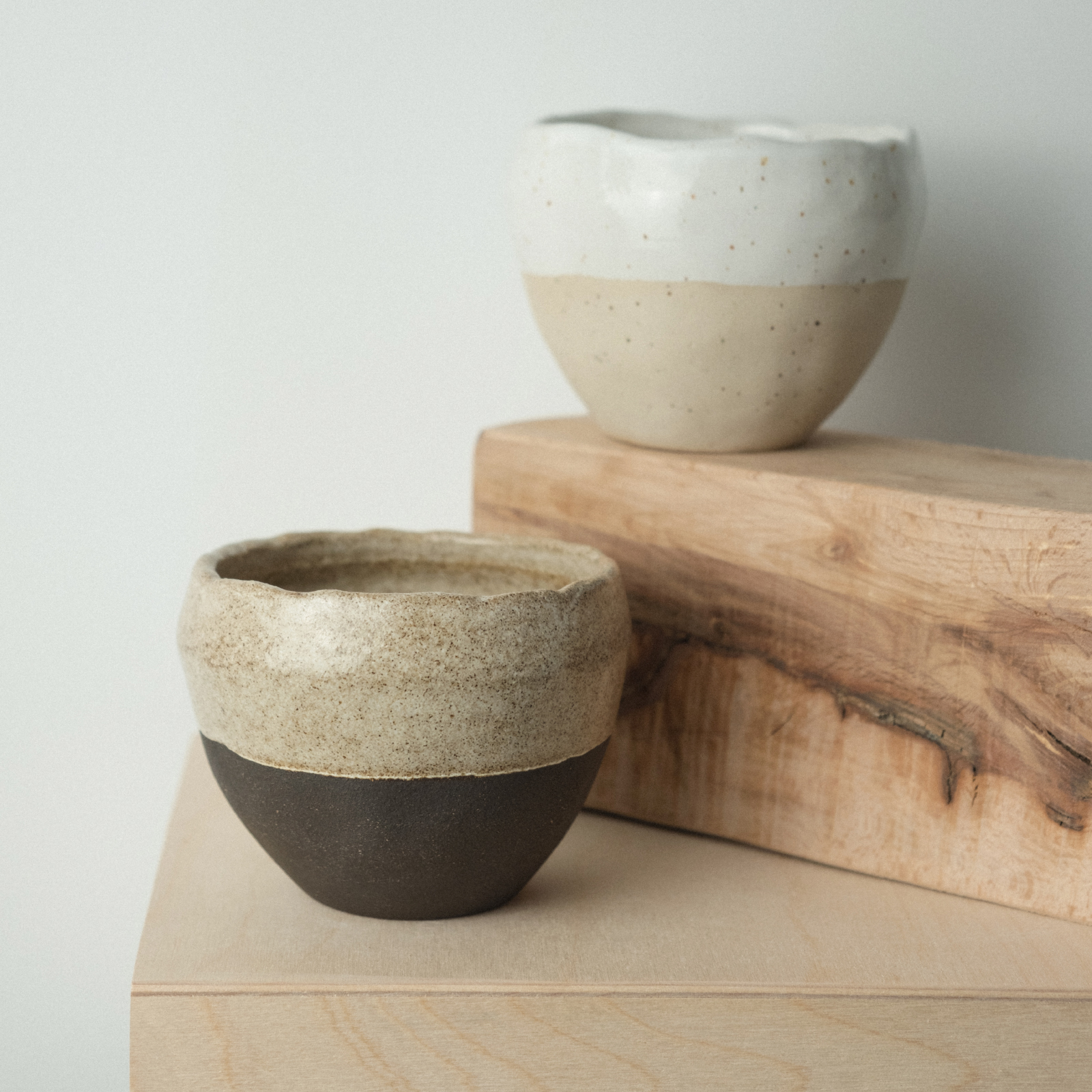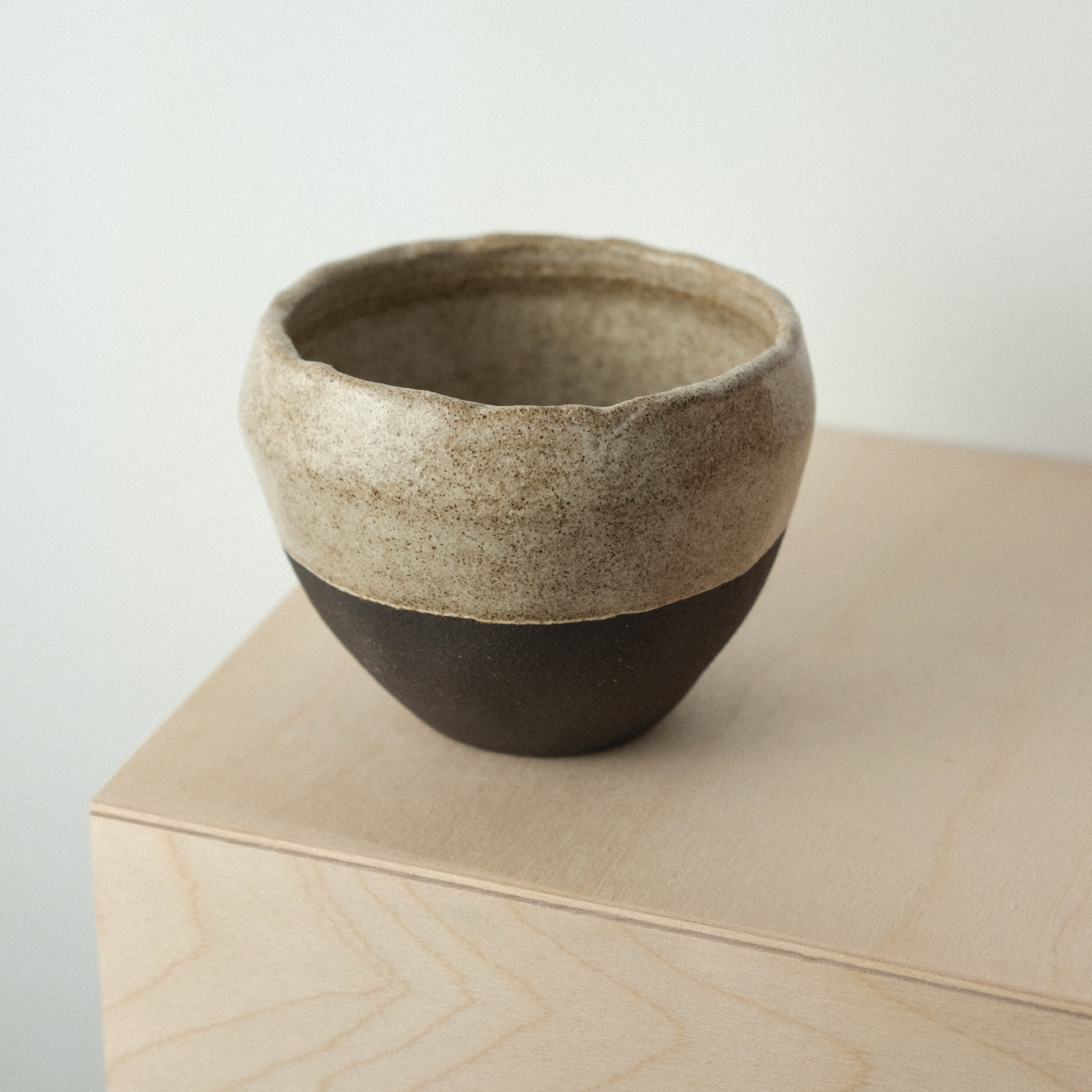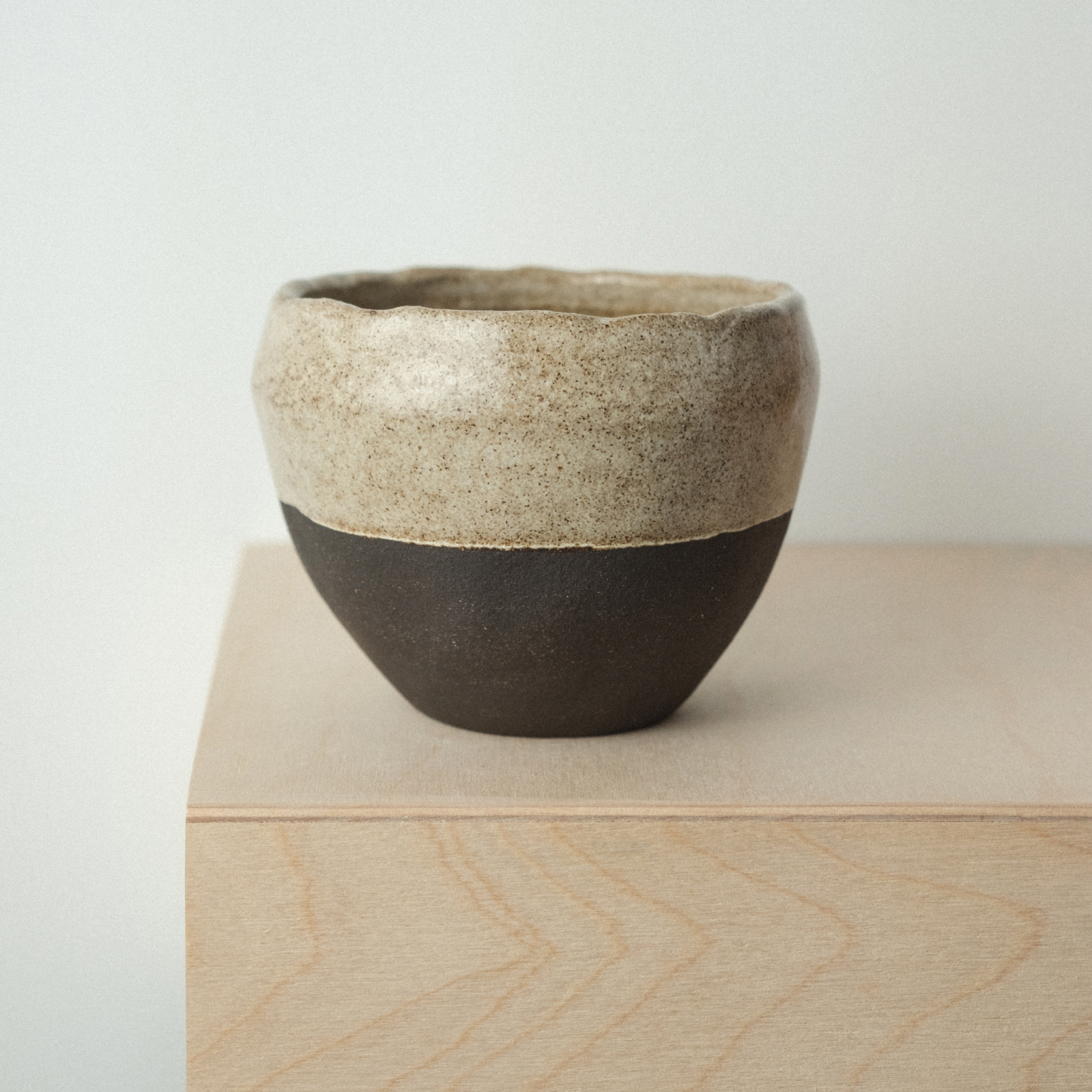 Ceașcă Latte realizată manual din gresie ceramică maro închis - neagră, de înaltă calitate, arsă la 1250 de grade Celsius. Peretele de ~6 mm menține excelent căldura și este extrem de durabil. Ceștile pot fi curățate în mașina de spălat vase. O alegere perfectă pentru utilizarea zilnică. Pe cești se poate simți textura lutului, iar glazura albă/crem cu efecte speciale, adaugă un plus de autenticitate și naturalețe designului.